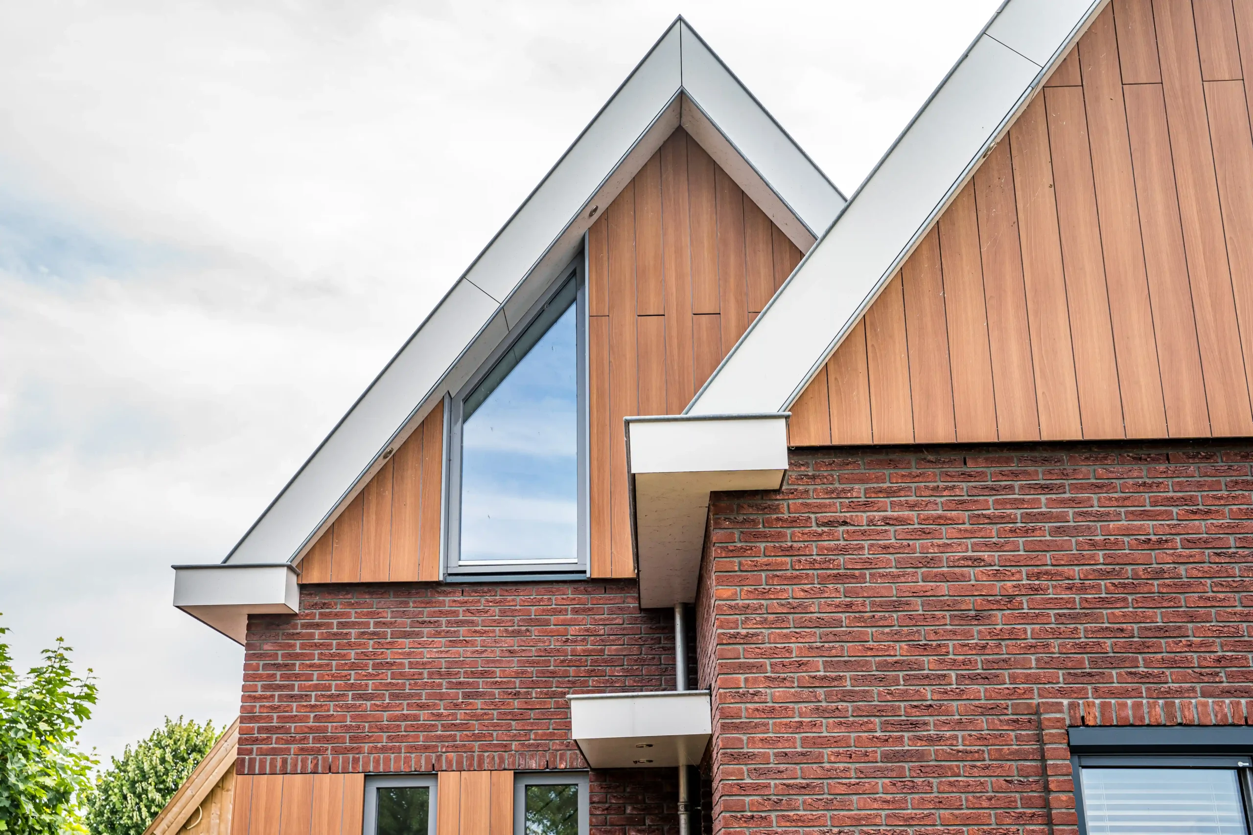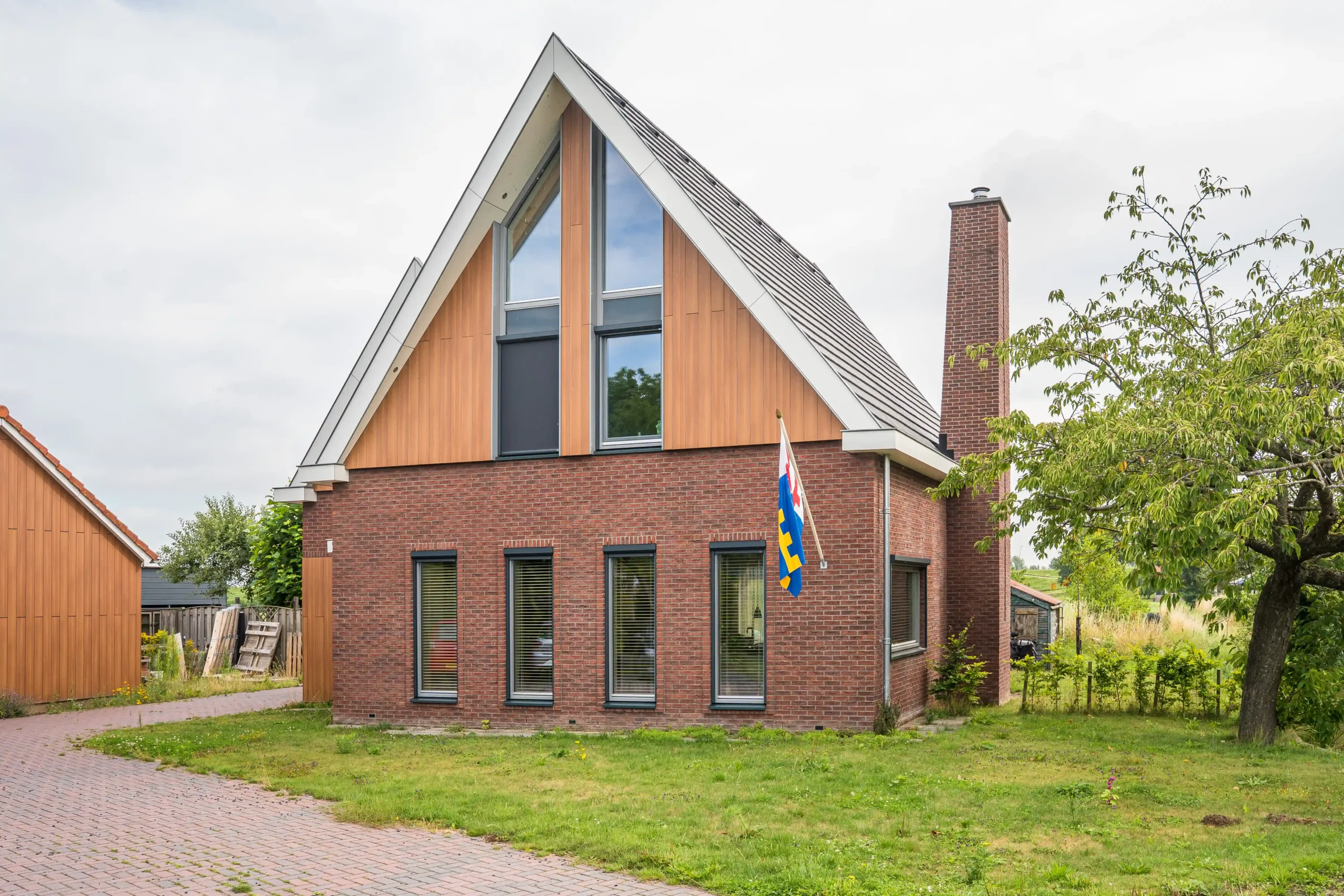 Deze prachtige woning heeft een mooie detaillering waar baksteen gevels, verticale gevelbekleding en strakke goten en overstekken mooi op elkaar aansluiten. Ook de vrijstaande schoorsteen die taps toeloopt is een echte eyecatcher.