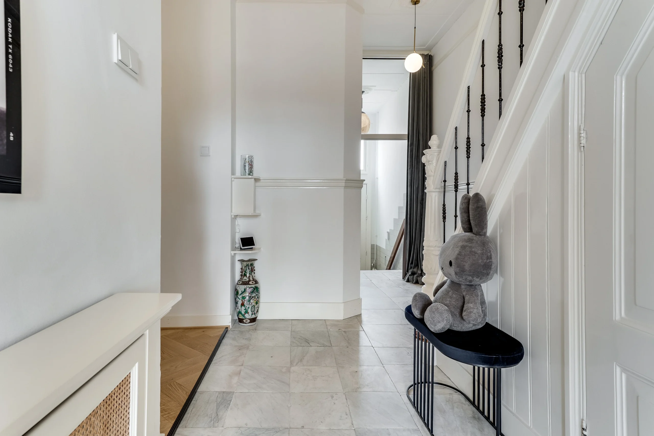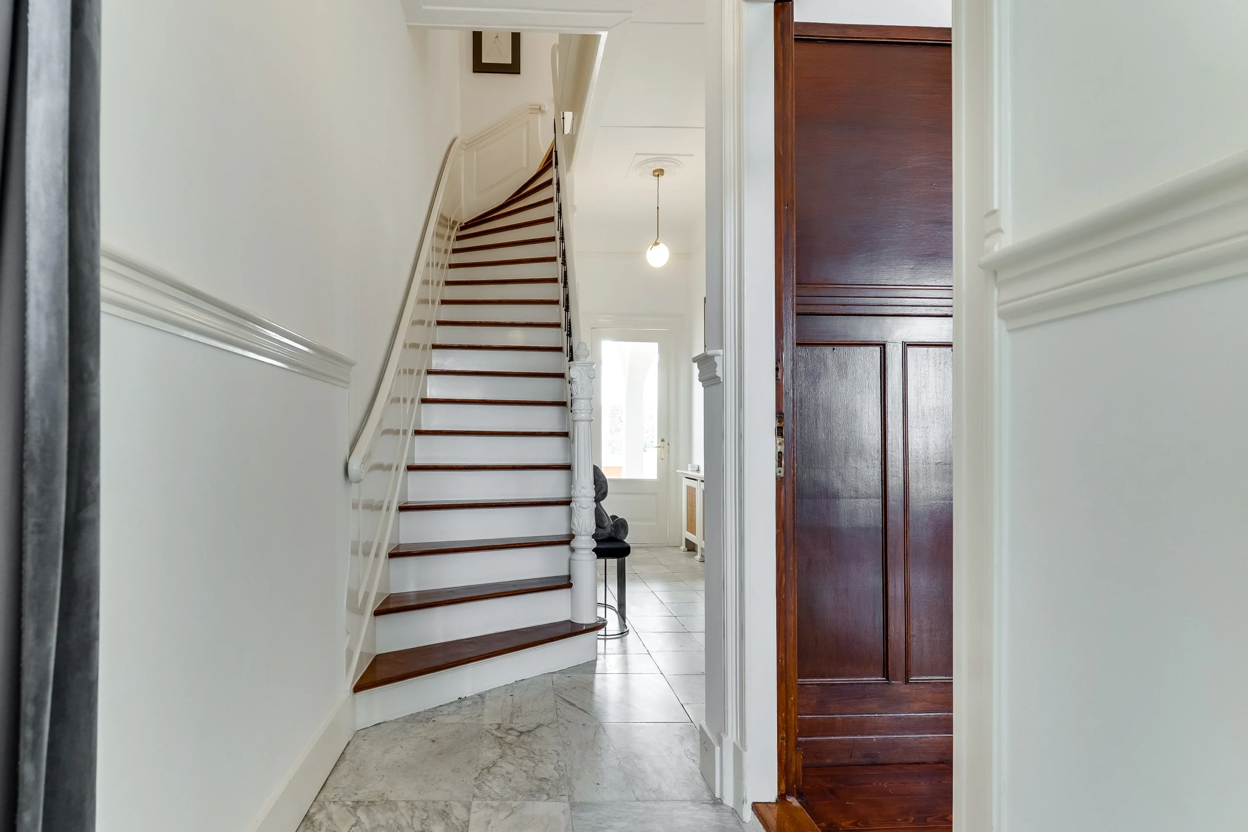 Op de bel-etage hebben we de monumentale marmeren vloer gedemonteerd, hersteld en teruggeplaatst op de onderliggende troggewelven. Daarnaast is er een gastenbadkamer gerealiseerd, alles ingepast in de monumentale setting van het pand.