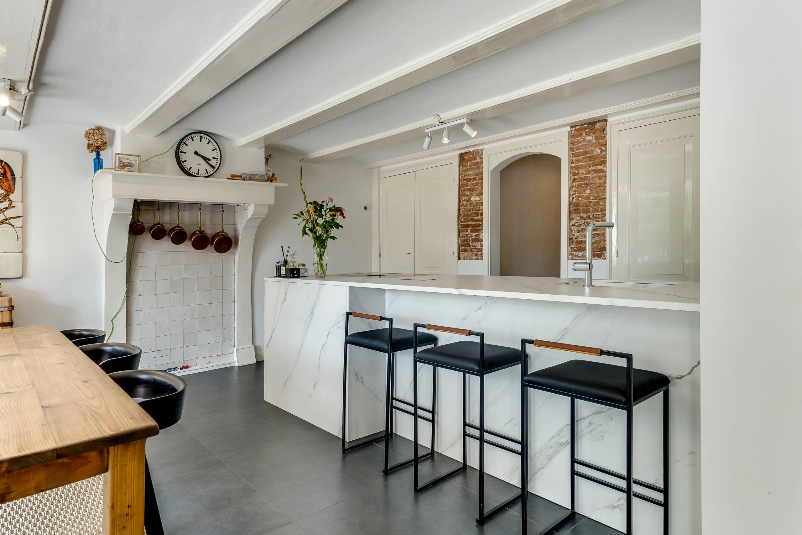 We hebben de indeling van het bestaande achterhuis aangepast en constructieve doorbraken gemaakt. We hebben de bestaande vloer voorzien van vloerverwarming en de installaties zijn aangepast aan de nieuwe indeling en gebruik.